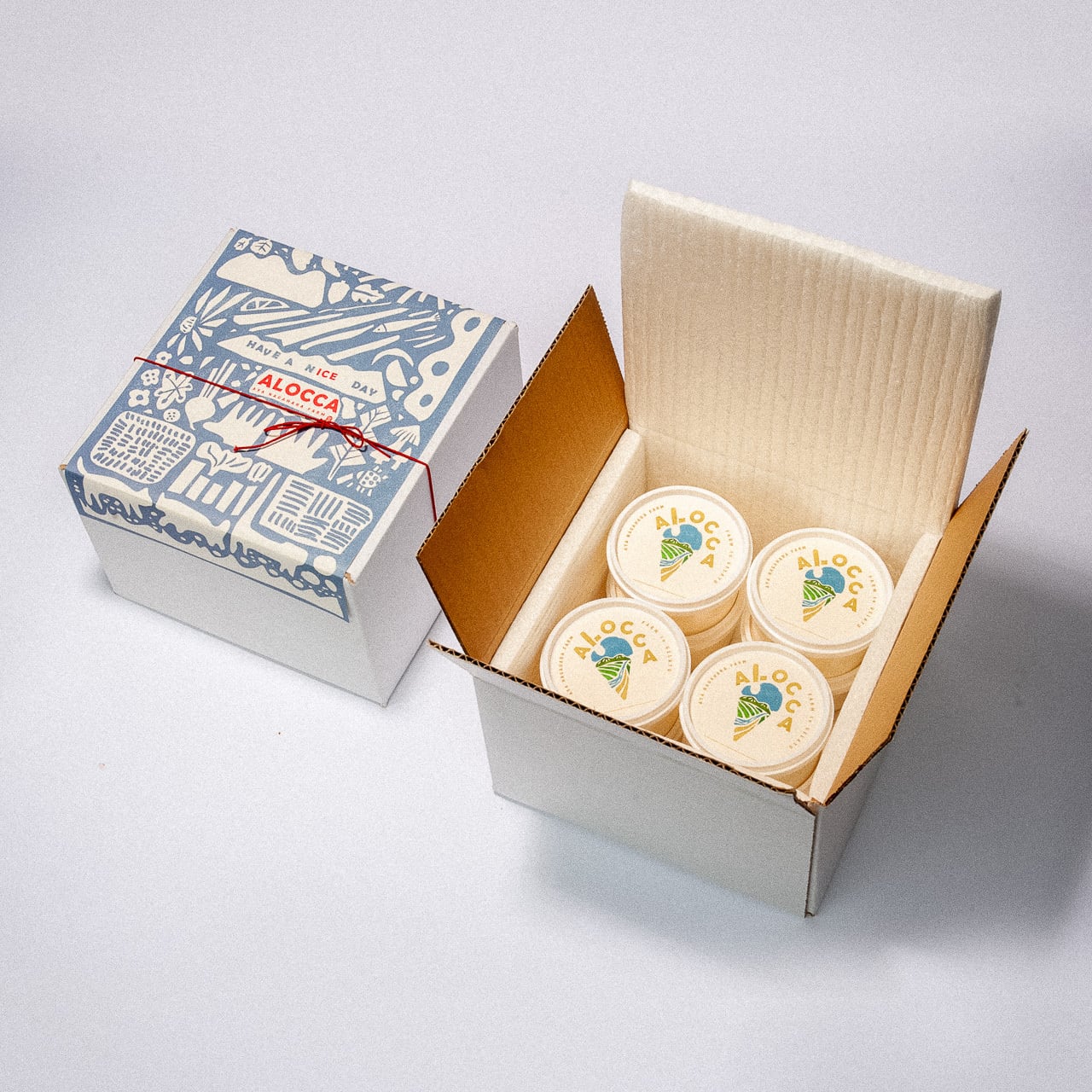 〈ただいまのジェラートフレーバーリスト〉から4個をお入れします。フレーバーはお任せになります。